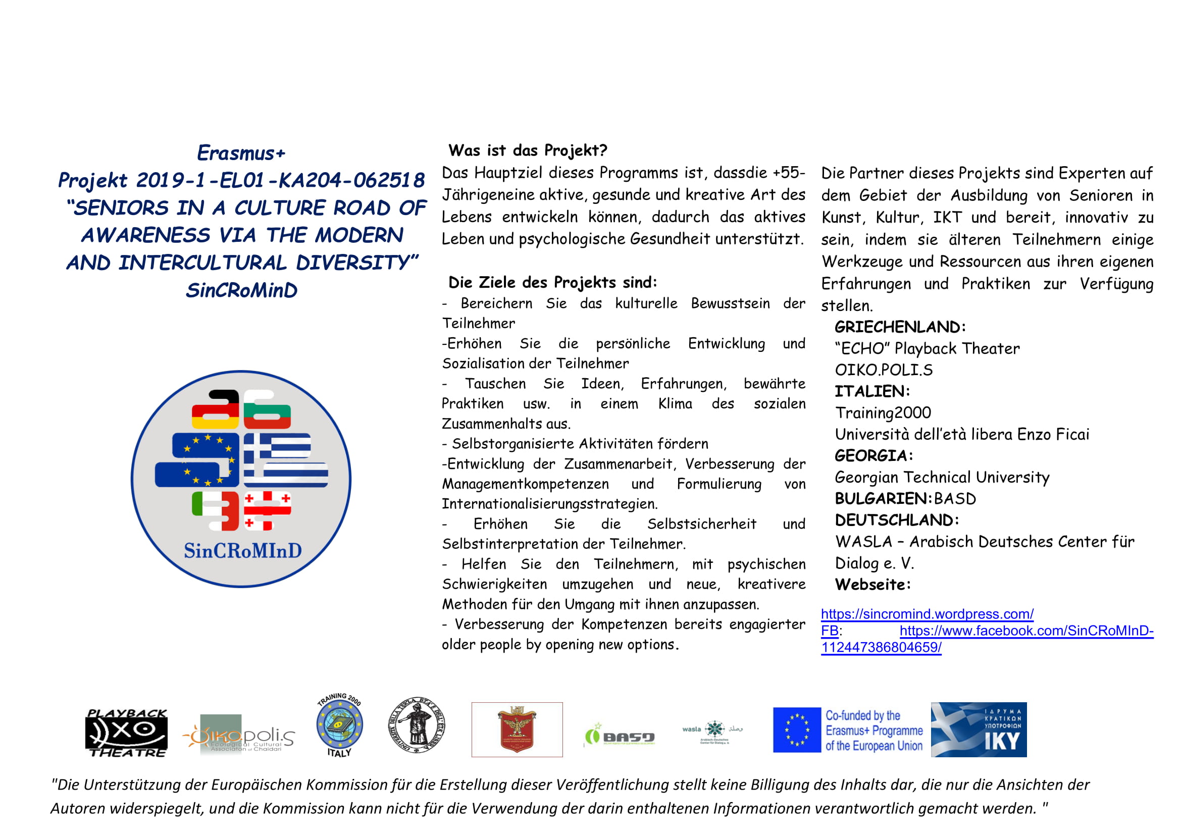 The partners of this project are 7 organizations from Germany, Greece, Georgia, Bulgaria and Italy that have expertise on the fields of Arts, Culture, and ICT with seniors and are willing to be innovative in giving seniors some tools and resources from their shared experiences and practices.