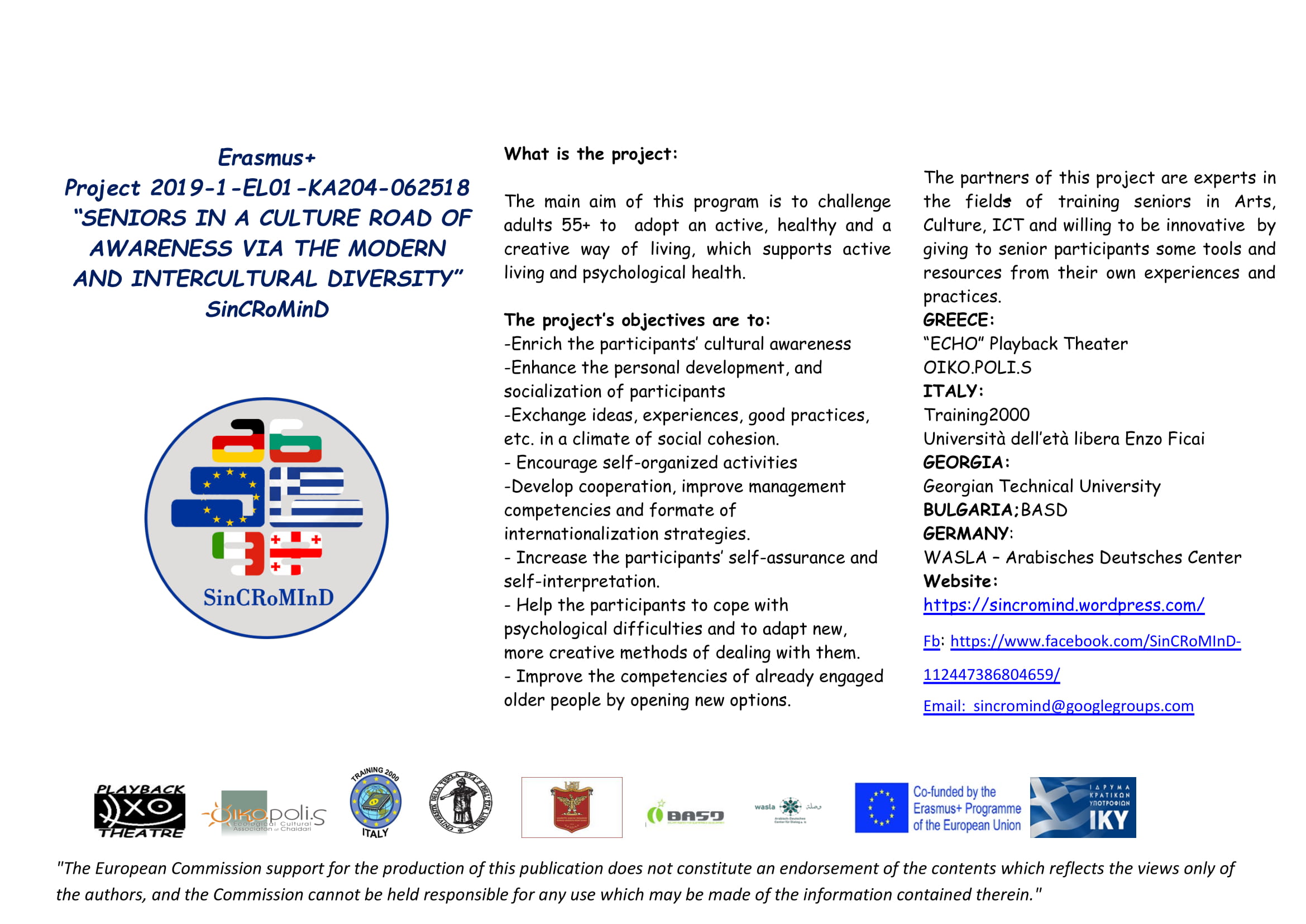 The partners of this project are 7 organizations from Germany, Greece, Georgia, Bulgaria and Italy that have expertise on the fields of Arts, Culture, and ICT with seniors and are willing to be innovative in giving seniors some tools and resources from their shared experiences and practices.